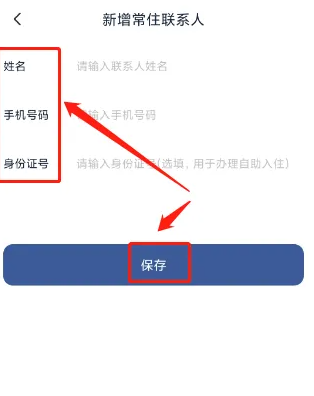 进入新增常住联系人,输入姓名、手机号码、身份证号,点击【保存】。