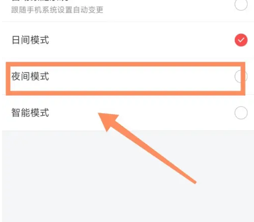 在“主题模式”设置页面,选择“夜间模式”即可完成。