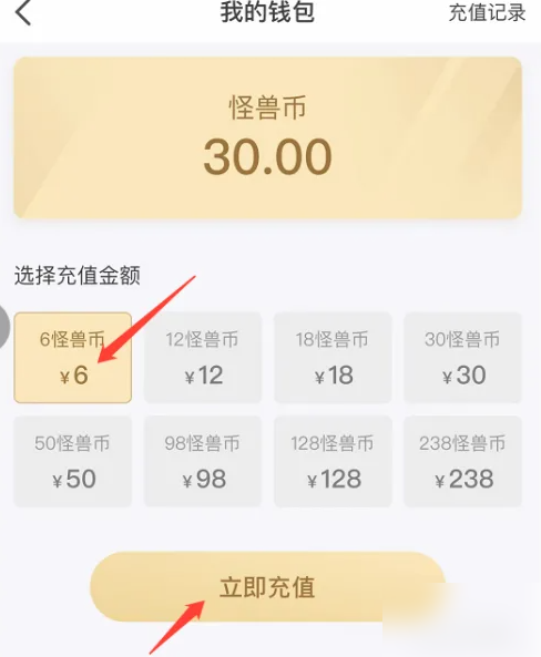在“我的钱仗茄包”页面,选择【充值金额】,点击【立即充值】选项,即可完成图怪兽APP怪兽币的充值。
