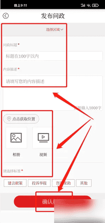 进入发布问政界面,选择区域、填写问政标题、内容描述、点击获取位置、上传相机或视频、选择标签,点击【确认提交】。