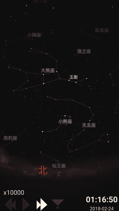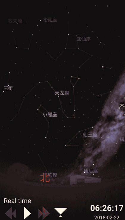 在图4的界面中,点击右下角的时间,将进入实时播放模式,如图5所示。在此模式下,时间持续流逝,而屏幕则实时展现对应时间点的星空景象。用户可以通过触摸并拖拽星空,使其快速演变,同时,右下角的时间(代表当前星空所对应的具体时刻)也会随之迅速变动。