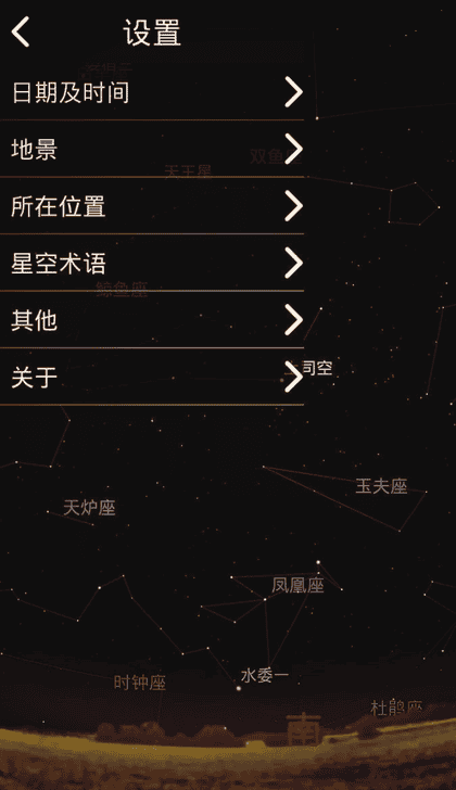 图1展示了启动Stellarium后的界面概览。在界面底部,一系列关键按钮从左至右依次排列:设置按钮、放大/缩小按钮以及实时显示当前时间的功能。借助这些按钮,用户可以轻松地操控界面,深入探索天空的奥秘。同时,通过在屏幕上流畅地滑动手指,天空与地景的移动和旋转变得轻而易举,为用户带来沉浸式的体验。