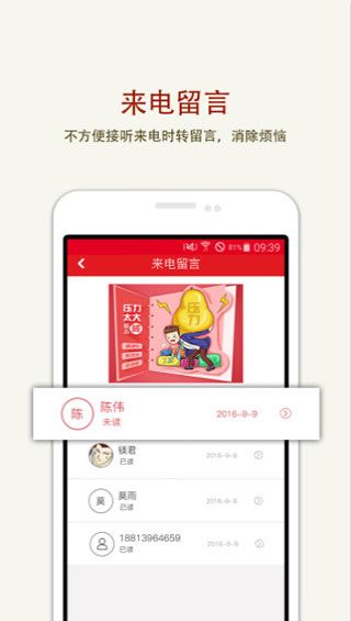 2.漏话提醒: 手机关机/无信号时来电转语音信箱,可随时查看,重要来电不错过;