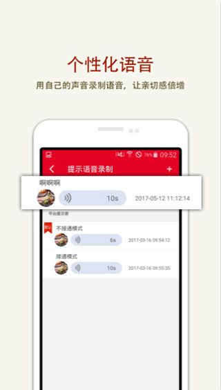 3.自录提示语:支持自定义提示语音,用自己的声音录制应答语,让来电用户听到倍感亲切。