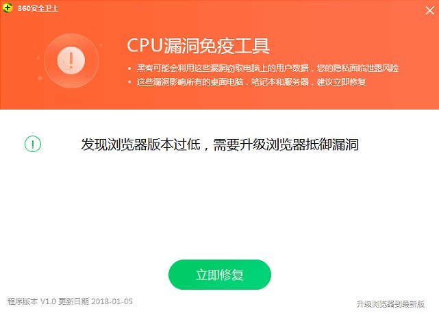 由于CPU漏洞的最大威胁是针对浏览器的恶意网页攻击,免疫工具会对浏览器进行检测,提示用户升级到已有补丁的最新版本,从而阻断恶意网页攻击CPU漏洞的入侵通道,为此漏洞唯一的远程攻击入口建立牢固的安全防线。