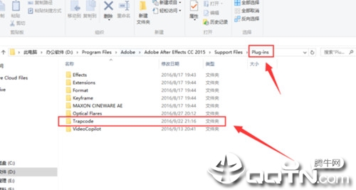 3、已经打包好的Trapcode文件,直接复制到Plug-ins目录下面,复制进去就代表安装,就代表安装成功了。找到自己的AE安装路径,主要找到装特效文件的文件夹,他的位置是:X:Adobe After Effects CC 2015/Support Files/Plug-ins,“X”是代表你个人的安装盘路径,举例:我的AE安装路径是:D:Program Files/Adobe/Adobe After Effects CC 2015/Support Files/Plug-ins