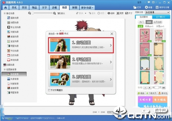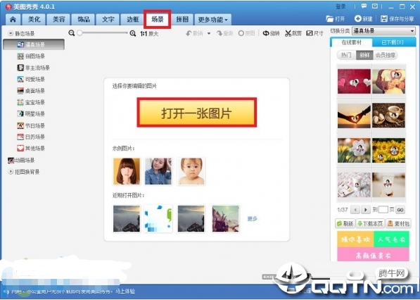 ①首先打开美图秀秀,选择“场景”,再打开一张需要抠图的图片源文件;
