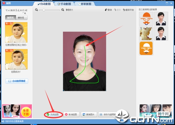 4、用抠图笔在证件照人物头像上随意画几下,抠图笔会自动帮证件照自动抠图。抠好后,点击完成抠图