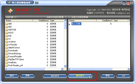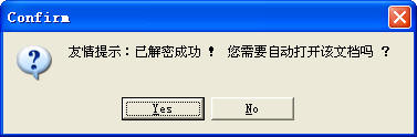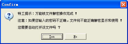 如果要解除移动硬盘文件或移动硬盘文件夹的加密保护,只要在软件“当前已加密的数据”中选择需要解密的文件或文件夹,单击“解密”即可完成,文件或文件夹解密后会从“当前已加密的数据”中消除,并重新在软件左侧“当前未加密的数据”和Windows资源管理器中现身。同时弹出人性化对话框,询问用户是否需要自动打开该数据。