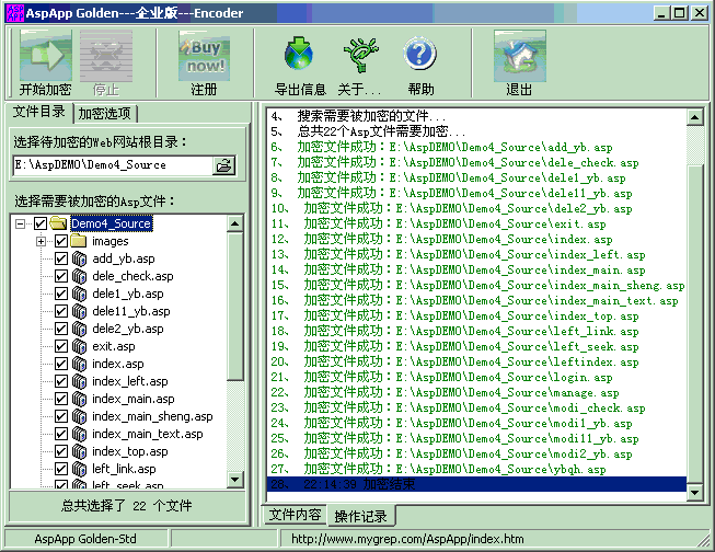 AspAppEncoder.exe的功能是把您指定目录下的Asp文件的内容进行加密。(如图一,“Web网站根目录”是您开发的网站源代码所在目录,并在下面所列出的Asp文件中选择您需要加密的文件)。