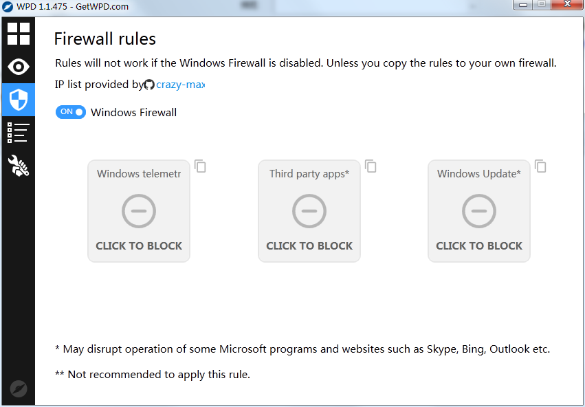 3、点击「Firewall」就是可以对系统防火墙进行打开关闭,并且可以让你对系统的自带应用、第三方软件或者是 Windows 更新进行拦截。