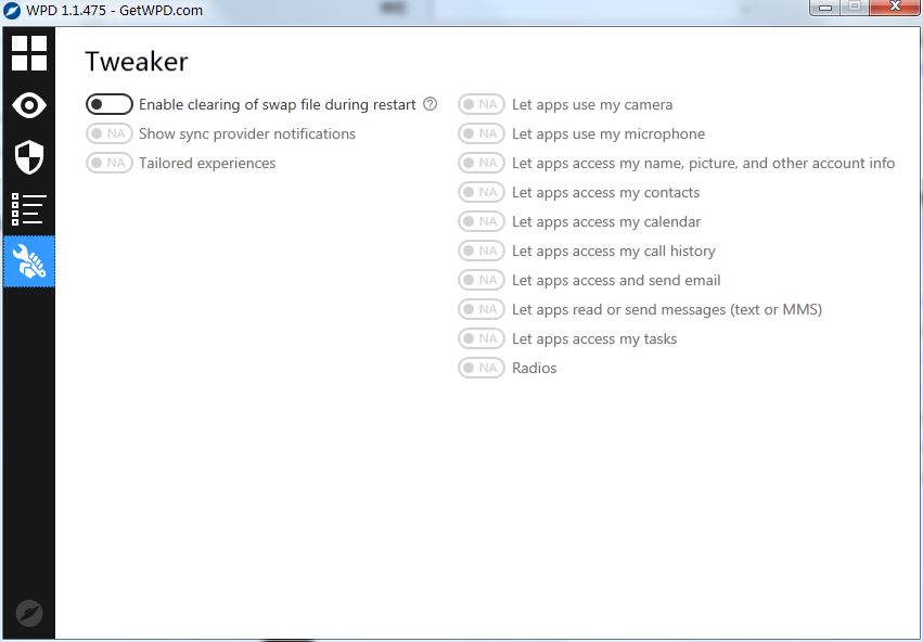 隐私区域允许启用或禁用30多个组策略,Windows服务或计划任务。很多这些看起来有点隐秘 - UsbCeip,dmwappushservice,Sqm-Tasks - 但是经常有帮助的文本解释了服务的功能,在某些情况下,如果禁用,会发生什么与类似的工具一样,该程序能尝试阻止访问特定遥测相关IP。不过,它不仅将这些转储到您的HOSTS文件中,更喜欢在Windows防火墙中设置自定义规则的更安全的选项,如果您不使用Windows防火墙,或者您更喜欢HOSTS方法,WPD可以将其IP地址覆盖到剪贴板,以便重新使用Tweaker设置包含应用程序权限(让应用程序使用我的相机),并添加一些一般的隐私设置,包含在PC启动时清除交换文件的选项