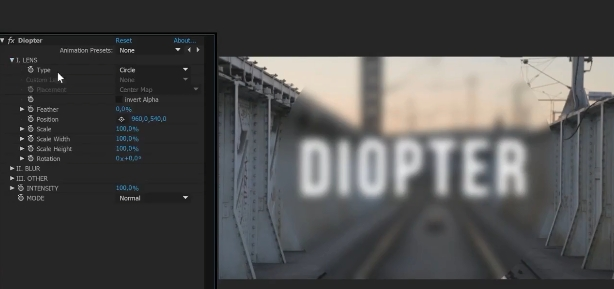 Diopter是一种可以在图层上添加光学效果(模糊,扭曲,着色)的插件。 在内置形状中选择镜片形状(面具)或使用另一层作为Luma Matte。 这个镜头可能会被改造。