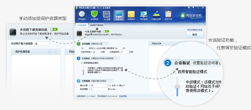 网站资源防盗链,针对不同站点设置防盗链过滤, 有效防止图片、软件、音乐、电影被他人盗链;网站特定资源保护,支持对doc、mdb、mdf、myd等特定资源防下载保护,确保网站重要资源安全。