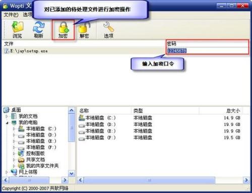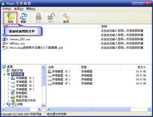 选择待处理文件。用户进入Wopti 文件加密器后,在左下方的文件夹数中选择待处理文件所在的文件夹,然后在右下方的文件列表中选择待处理文件并添加到待处理文件列表。添加的方式可以是鼠标双击右下方文件列表中的文件,或按住Ctrl或Shift键多项选择后将其拖放到待处理文件列表中。另外,您也可以点击“浏览”按钮添加待处理文件。