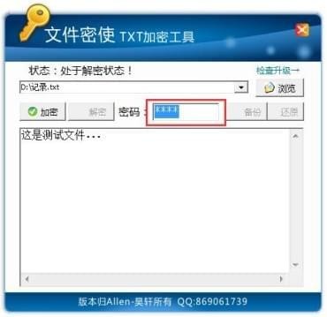 2.解密:拖入文本文件或点击“浏览”按键打开文本文件。输入密码按“回车键”或点击“解密”按钮即可解密并打开解密后的文件。