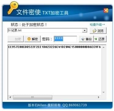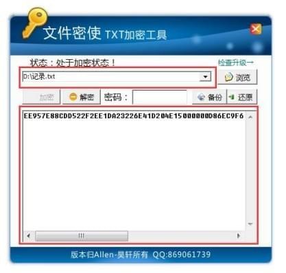 1.加密:拖入文本文件或点击“浏览”按键打开文本文件。输入密码按“回车键”或点击“加密”按钮即可加密。