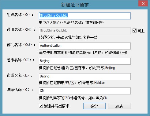 Symantec代码签名证书支持中文,部分平台在缺少中文字库时会出现中文乱码,推荐使用英文信息注册代码签名证书。 2.完成证书请求并导出证书请求文件点击确定即可导出证书请求文件(.csr格式文件)并生成证书请求。