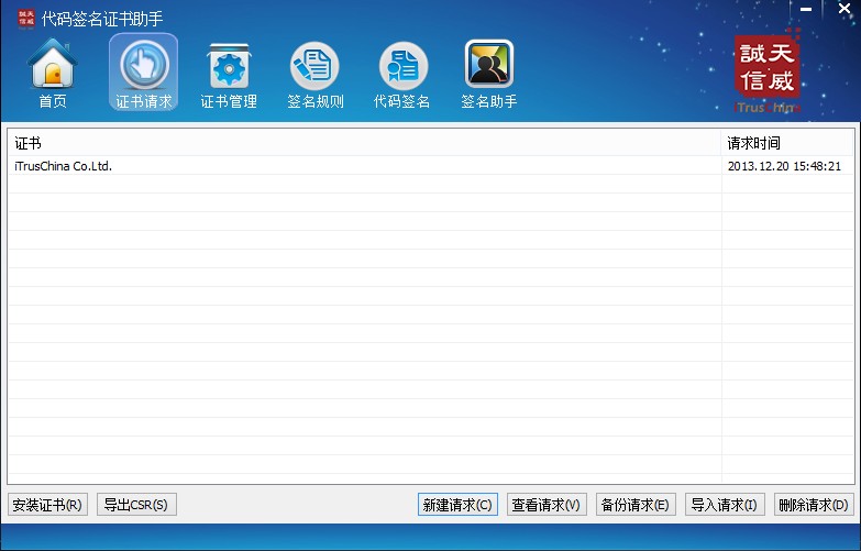 一、创建证书请求 1.开始证书请求运行“天威诚信代码签名证书助手”工具,选择“证书请求”并填写证书请求信息