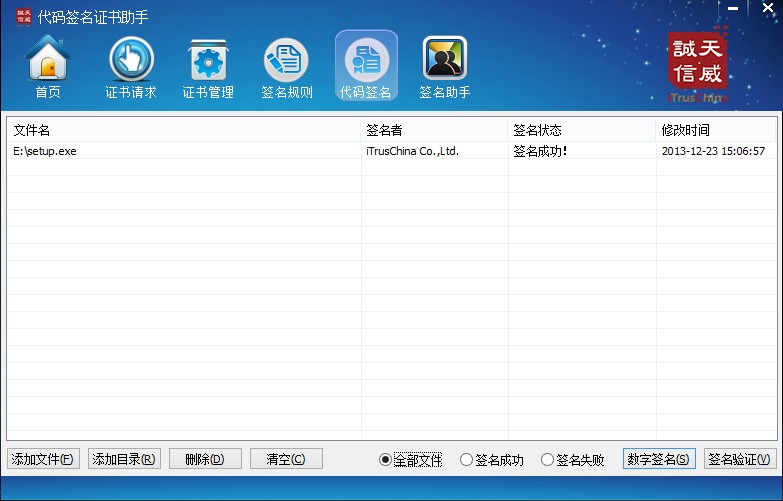 点击“数字签名”,选择签名模式(应用模式 或 驱动模式),证书助手将自动为签名列表中的程序添加签名信息。应用模式应用于普通的控件或桌面程序签名,驱动模式应用于64位操作系统下的驱动程序文件签名。 3.验证代码签名数字签名完成之后,证书助手将自动为已签名的文件进行签名的验证。当签名列表中出现签名失败或时间戳签名失败的文件是,可以选择显示“签名失败”列表,并为签名失败的文件重新尝试数字签名。已有数字签名的程序,添加到签名文件列表后,选择“签名验证”,即可执行代码的签名信息验证,自动获取签名列表中的文件的签名信息。