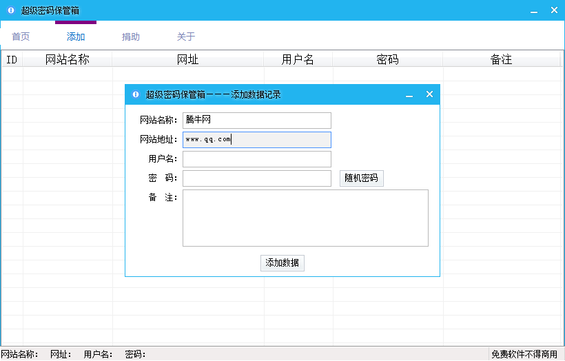 输入网站名称,地址,用户名和密码,可以设定一个随机密码