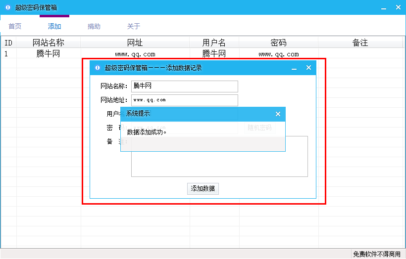 只要记住一个进入超级密码保管箱的密码就行了,软件采用了最新的字母和汉字异位加密技术,就算你的密码是汉字,也同样可以进行加密,采用数据库管理密码等资料,直接打开数据库只能看到一堆乱玛,即使你的数据库被其他人复制走,只要他不知道你进入超级密码保管箱的密码,就算他也安装了超级密码保管箱,也是无法打开的。