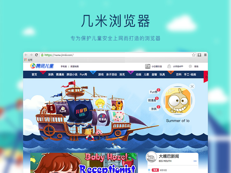 几米浏览器,专为儿童安全上网而打造的浏览器,让每个孩子都能在安全的网络环境中成长,上网从此不再让家长担心,浏览网页的防护措施,保障孩子们的科学上网好工具。