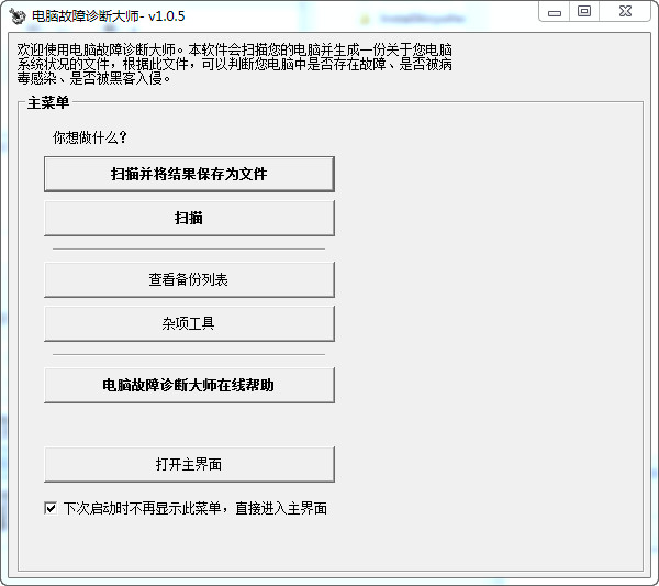 电脑故障诊断大师全面检测和修复各种系统问题,维护系统稳定和安全,欢迎使用电脑故障诊断大师。本软件会扫描您的电脑并生成一份关于您电脑系统状况的文件,根据此文件,可以判断您电脑中是否存在故障、是否被病毒感染、是否被黑客入侵。