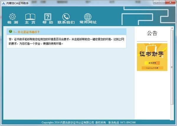 内蒙古CA证书助手是一款保证上网环境安全的软件,它的页面简洁友好,功能强大,可以帮助用户检测上网环境是否符合要求,使用起来简单便捷,可一键修复环境,保障网上交易安全及数据安全,感兴趣的朋友快下载试试吧。