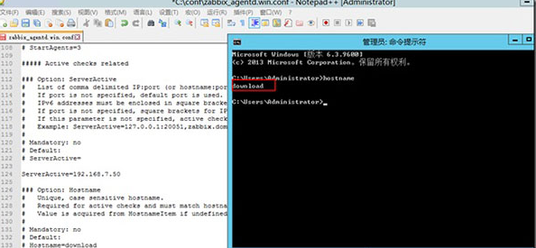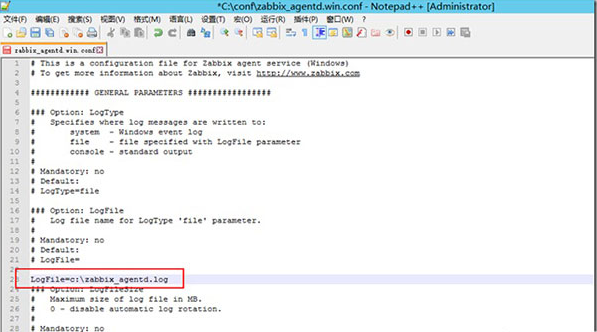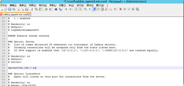 2、找到conf下的配置文件zabbix_agentd.win.conf ,修改LogFile、Server、ServerActive、Hostname这四个参数。具体配置如下:LogFile=c:\zabbix_agentd.logServer=192.168.7.50Hostname=downloadServerActive=192.168.7.50 #zabbix server地址①logfile是zabbix日志存放地址,Server 是zabbix服务端ip地址,Hostname是本机机器名
