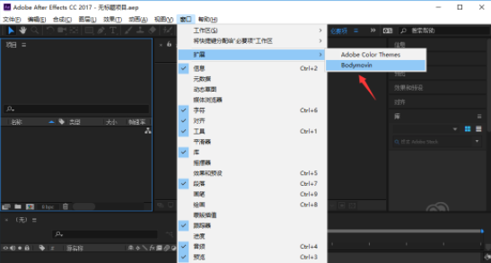 4.在软件顶部window窗口菜单-扩展下即可看到bodymovin脚本
