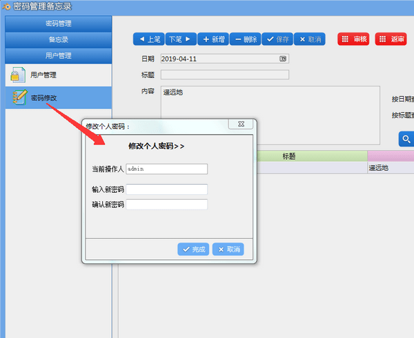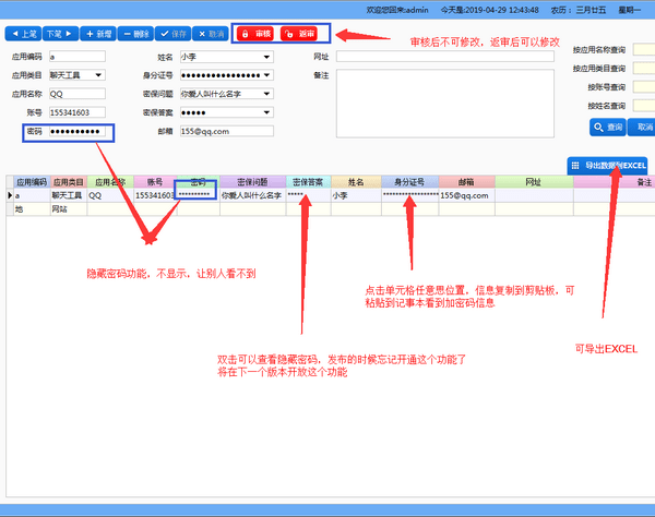 全新开发本地密码管理软件 ,于之前的版本不同,本版本是新全新设计,不当当是本地密码管理功能 ,包括了密码管理,记事薄,(生日提醒管理,等待开发中)等多项功能于一体的本地备忘录工具。希望新们给出建议,我在此版本上继续开发,软件完全是免费的。开放平民,喜欢的评价一下,这样我才开发的就劲有朋友需要便携版,因为便携没有对数据库进行封装,所以暂时没有发布,后面我尽可能在完善软件后进行封装便携版