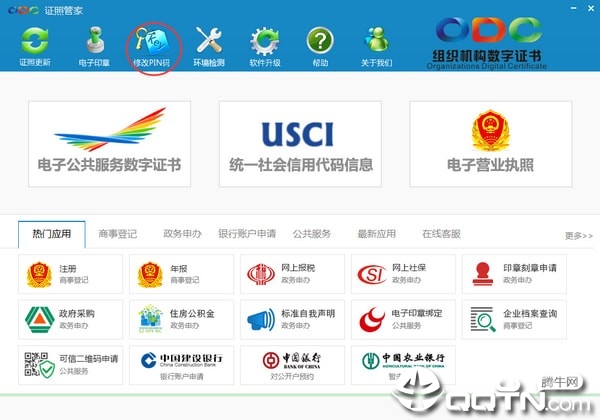 1、打开客户端,插入组织机构数字证书,点击“修改PIN码”,如下图: