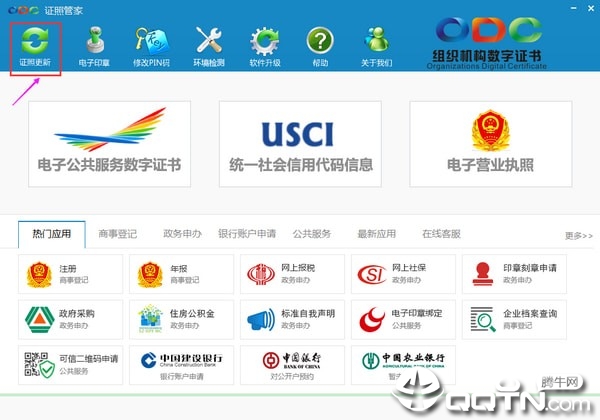 1、点击数字证书客户端左上角“证照更新”按钮,出现更新界面,如下图: