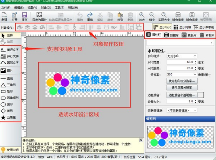 软件界面主要由标题栏、操作按钮区域、工具栏、透明水印编辑区域、属性栏、模板库、素材库、缩览图等区域构成。其中最常用的是工具栏、属性栏和透明水印编辑区域。