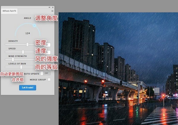 BBTools RainFX是一款为Photoshop用户提供的下雨环境制作插件,这款插件可以帮你制作出效果非常真实的雨水天气,你可以通过插件对下雨的角度、雨量、风速进行设置,推荐有需要的用户下载使用。