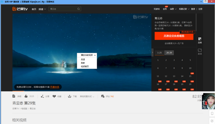 3. 在视频播放页点击鼠标右键 播放当前视频 即可免费观看!