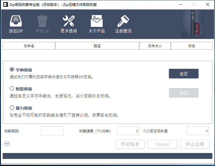 通过我们内置的密码字典快速恢复和破解ZP密码。