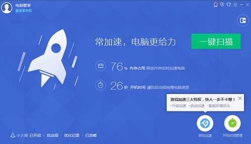 电脑管家全面加速,游戏上网全天候,卡慢预警更智能,开机加速赢在起步!