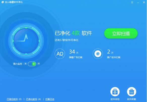 2、防护能力升级● 新增软件净化:智能拦截流氓广告和推广软件,还电脑一片纯净环境。据统计,86.97%的电脑用户桌面每天会有大小不同的广告弹窗,平均每台电脑每天收到5.85次广告弹窗。每安装5个应用软件,就有1次会被捆绑捆绑安装其他软件甚至病毒。受上述问题困扰的用户现在可使用软件净化功能对电脑进行扫描,可以轻松帮你解决其他软件自动下载静默安装的问题,同时自定义拦截广告弹窗(可允许或不允许任意软件弹窗)。