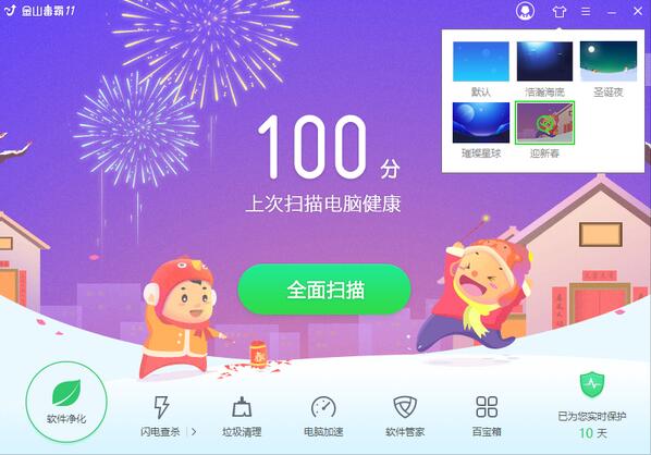 4. 界面美化● 全新皮肤专为烘托节日氛围而设计,每当喜庆日子降临,毒霸将以全新装扮展示在你的电脑桌面,增添节日气氛。