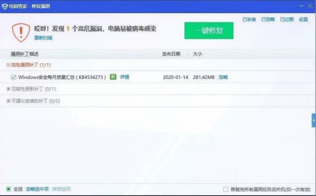 腾讯安全专家再次建议用户尽快安装系统补丁,以消除风险。Win10个人用户可使用腾讯电脑管家的漏洞修复功能、或windows update安装补丁。