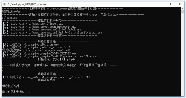 CVE-2020-0601高危漏洞来袭,win10用户遭遇黑产攻击,腾讯电脑管家率先支持修复,本程序实现针对CVE-2020-0601漏洞利用的样本检测,操作简单,只需要输入要扫描的文件夹,如果是全盘扫描则输入root,然后按Enter即可,赶紧下载查杀吧。