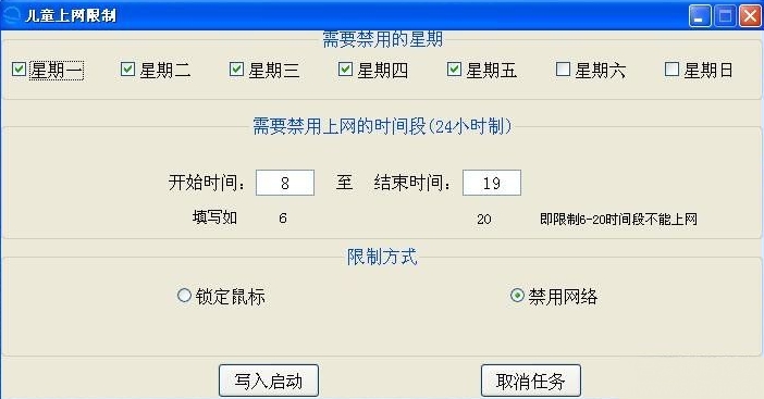 儿童上网限制是一款帮助家长管理孩子上网时间的软件,能在周一到周日分时间段来限制电脑使用,除了电脑加密还能够禁用网络和鼠标,有需要的家长朋友不要错过了,欢迎下载使用!