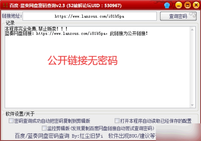 软件会自动切换接口,接口1未找到密码自动切换为接口2,如果点击按钮提示失败说明此链接不支持查询!就放弃吧!