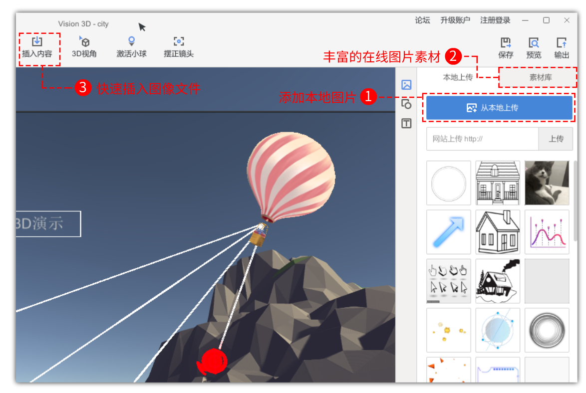 内置精美模板,直接套用即可输出文稿;内置大量2D/3D素材,搭建场景不费力。
