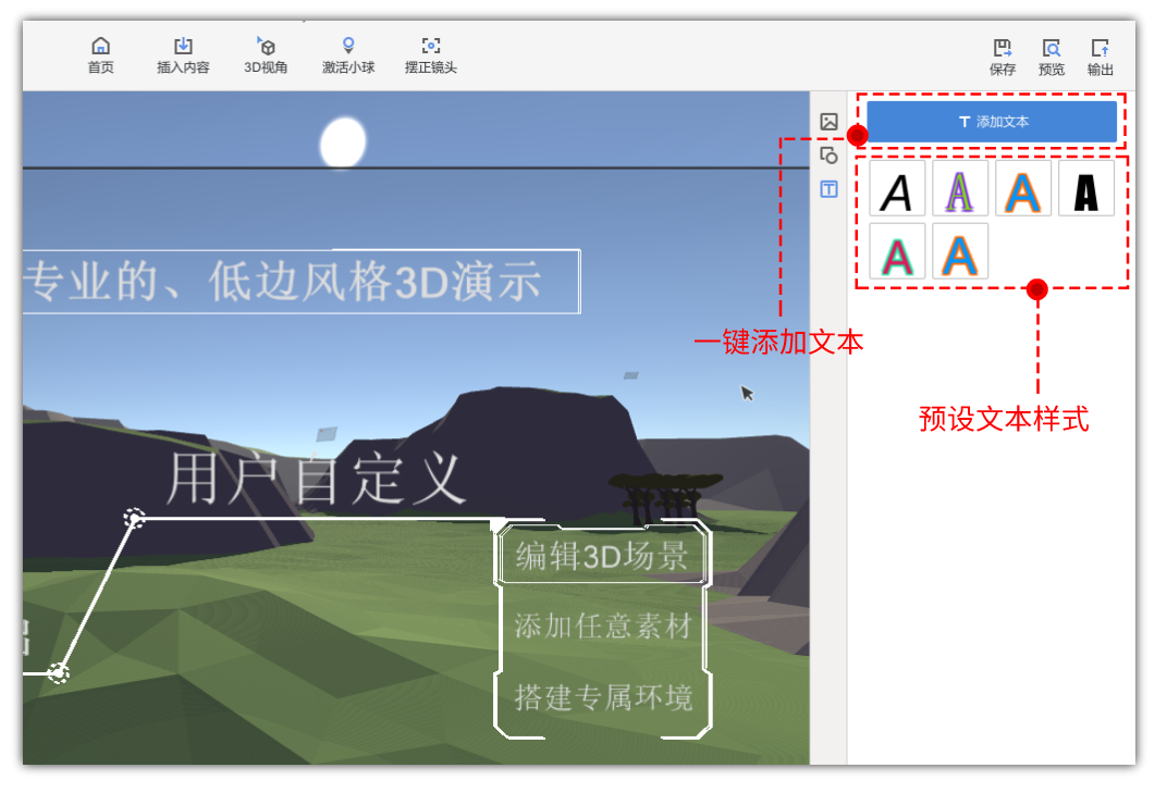 (2)插入文字:魅演3D提供多种预设文本样式,一键添加,直接输入内容。 或直接点击添加文本,可自定义其字体、颜色、大小、位置、对齐方式、文本间距等。