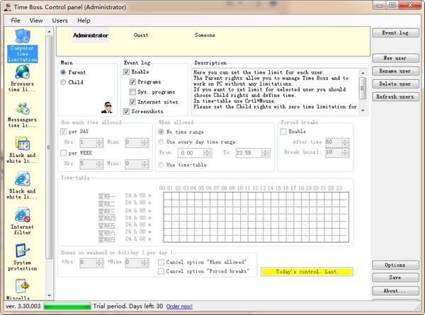 Time Boss一款电脑使用时间限制软,用户能够限制电脑使用的时间和某个文件夹内的单个或多个文件启动,并且还能够记录使用日志,是家长限制孩子玩游戏的好工具,有需要的用户不要错过了,欢迎下载使用!