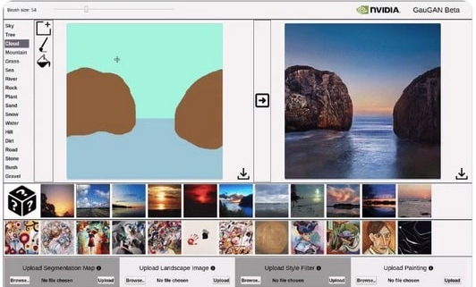 艺术家可以使用画笔和油漆桶工具来设计他们自己的景观,如河流,岩石和云。样式转换算法允许创作者应用滤镜 - 将日间场景更改为日落,或将照片级逼真的图像更改为绘画。用户甚至可以将自己的过滤器上传到他们的杰作上,或上传自定义分割地图和风景图像作为其艺术作品的基础