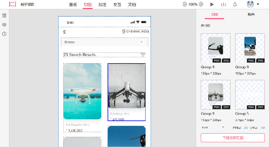 在空白处点击,右侧切图面板展示了该页面内所有切图,按Ctrl键进行多选,点击“下载选中切图”,可下载选中切图;点击“下载全部切图”,可下载全部切图。还可切换平台(iOS、Android、Web)和选择倍率。